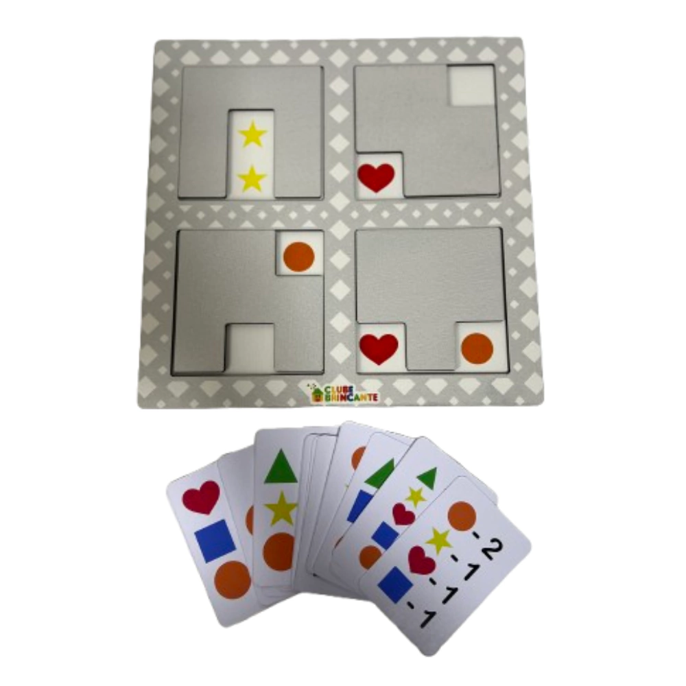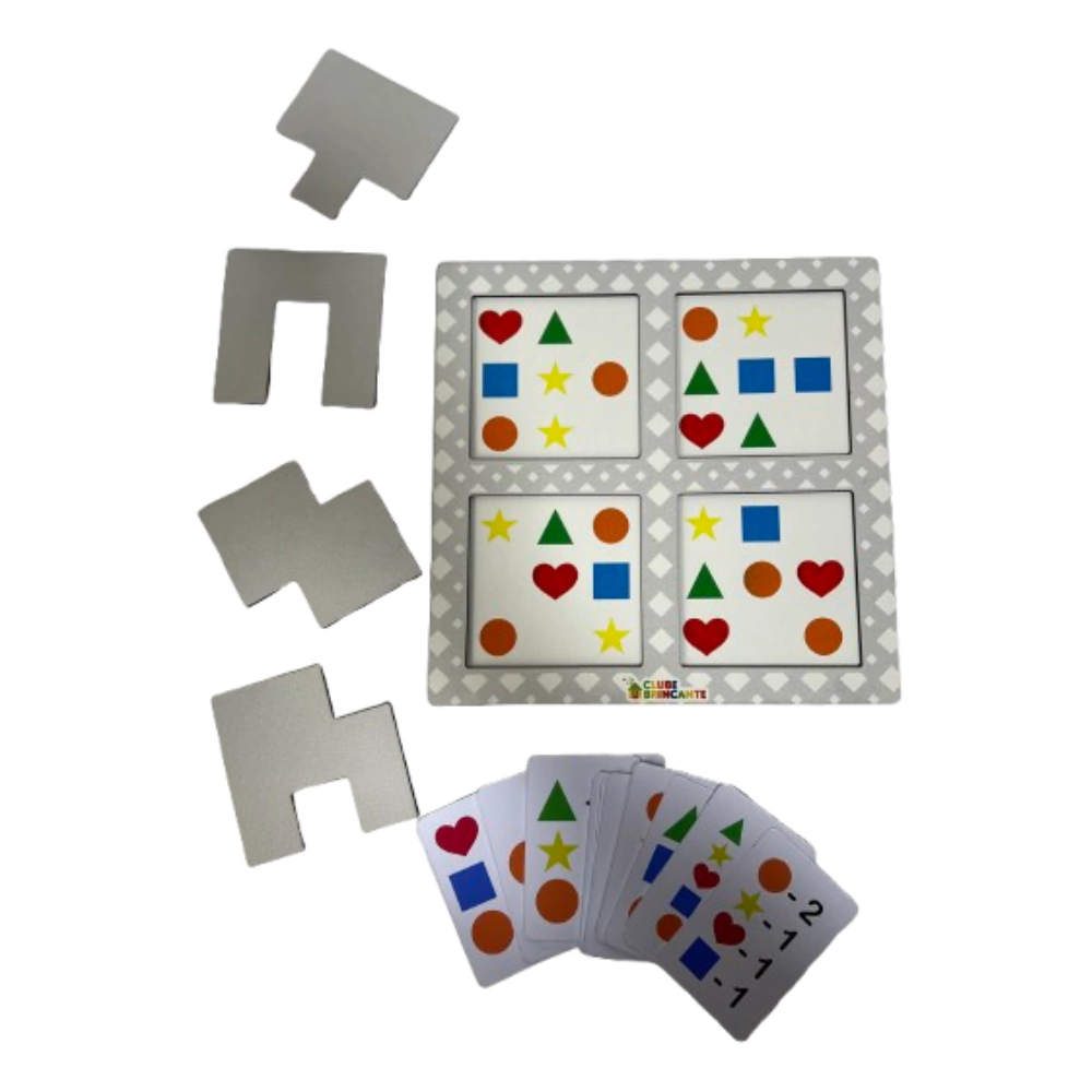O objetivo do material é encaixar as peças no tabuleiro até que apenas as formas indicadas no card fiquem visíveis.