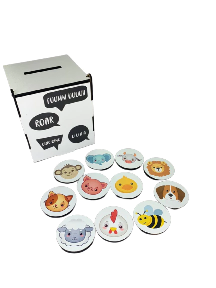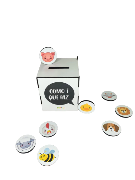 O objetivo do material é reproduzir o som que cada animal faz enquanto encaixa as fichas equivalentes na caixa. As onomatopéias consistem no uso de palavras que imitam/representam os sons ou ruídos. Possuem uma estrutura simples e por isso são mais fáceis de falar e muito importante no processo de aquisição da linguagem oral. Afinal, brincar de imitar os sons das coisas permite à criança aprender diversas palavras.