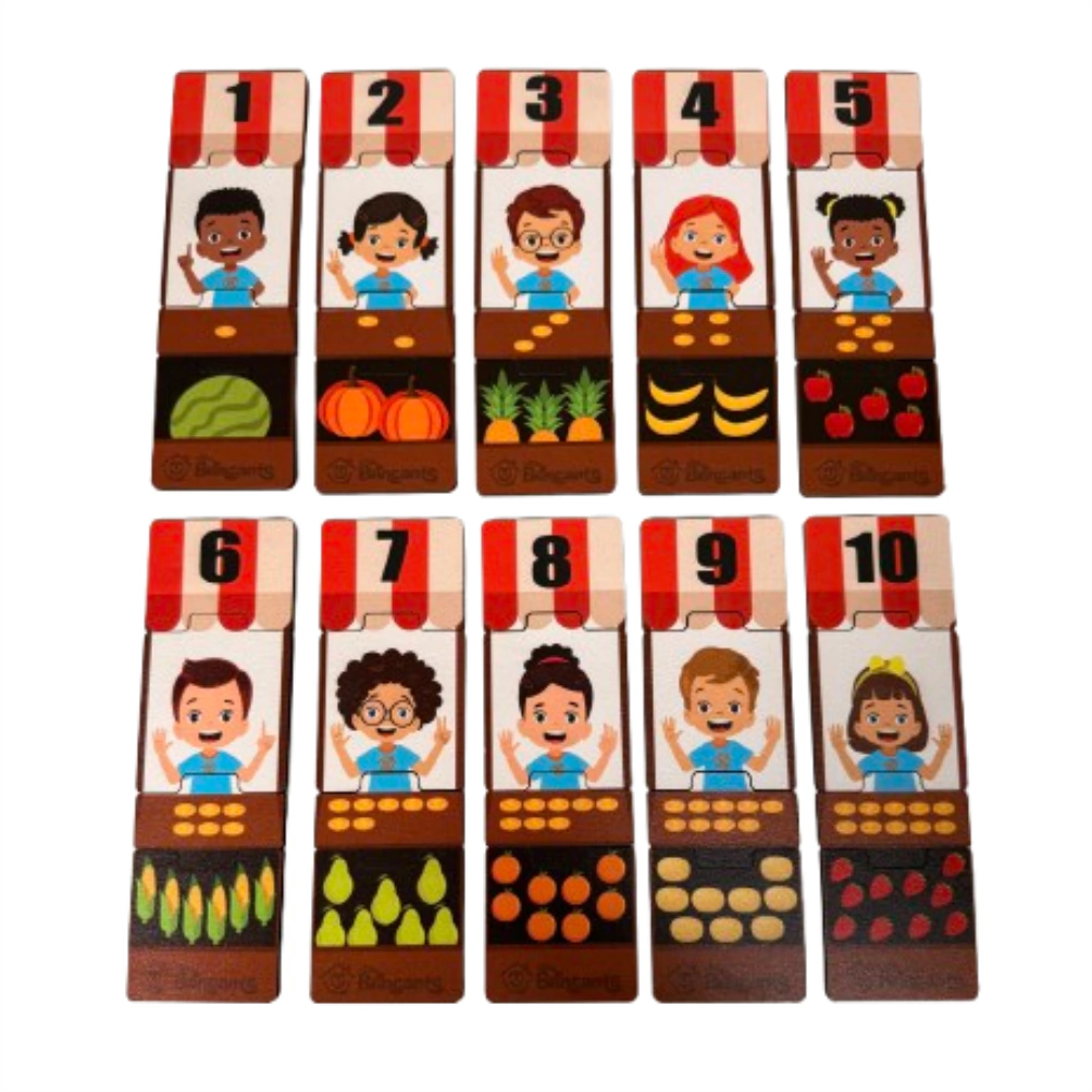 O objetivo do material é montar as bancas, observando o número e descobrindo qual criança, quantia de moedas e frutas correspondem a ele. Complete todas as feirinhas e divirta-se enquanto aprende!
