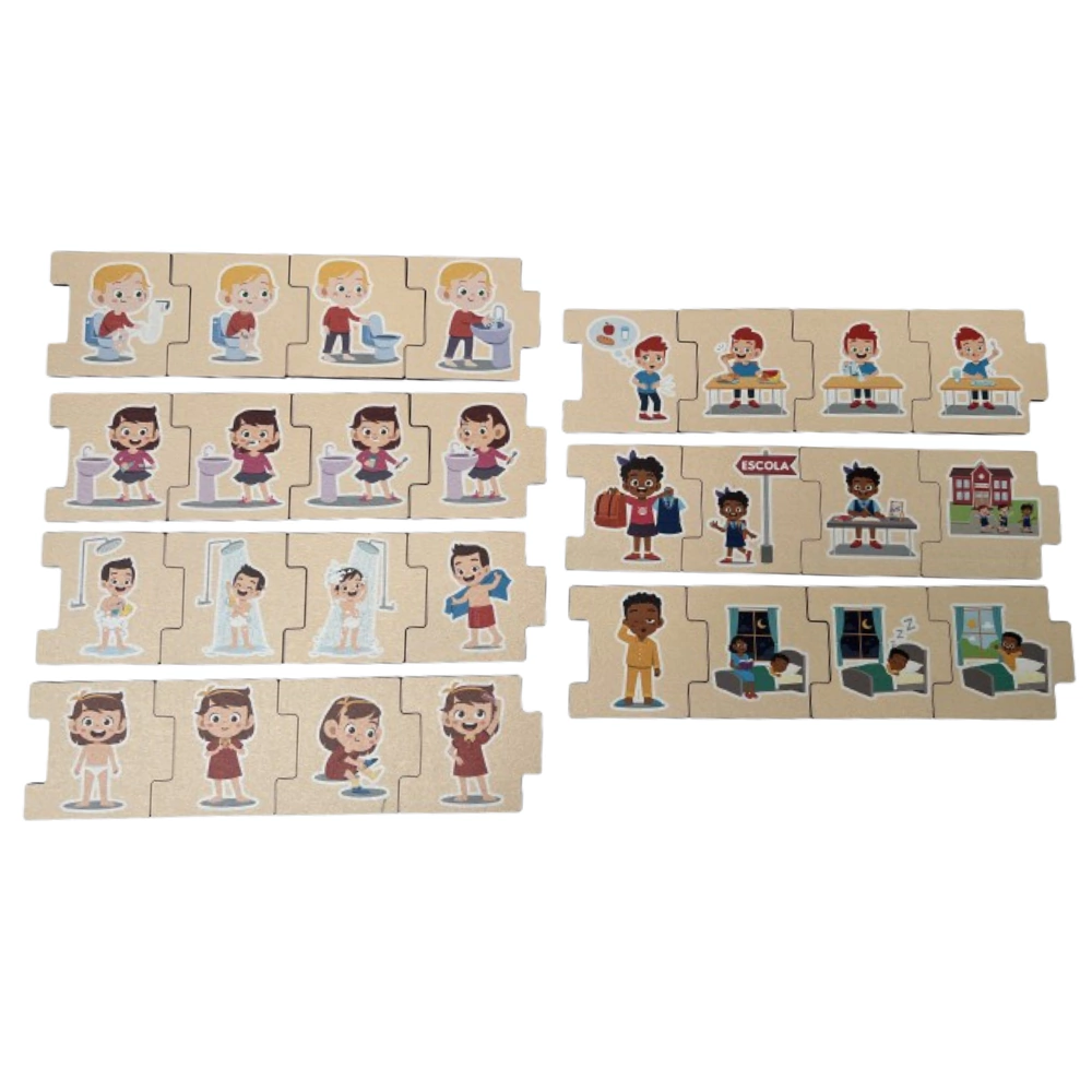 O objetivo do material é que a criança organize as peças em ordem cronológica, formando uma sequência lógica de eventos. Além de ser divertido, trabalha a percepção temporal e incentiva a comunicação, permitindo que os pequenos contem histórias enquanto colocam as ações na ordem correta.